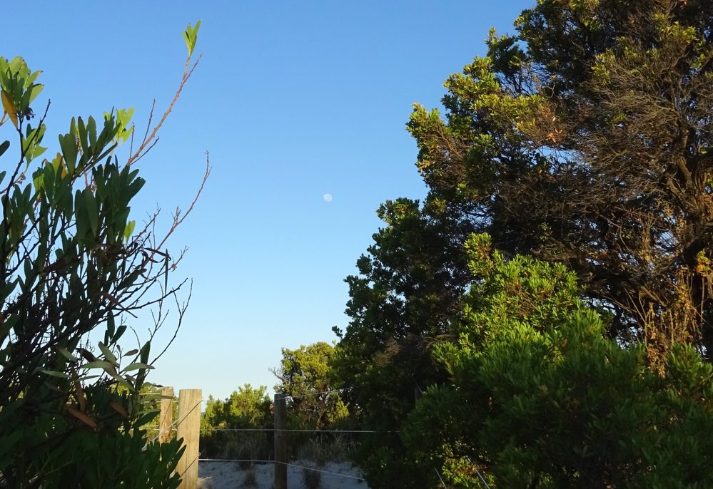 I wake the next day and cross the sand dunes on my way for a morning walk and see the moon still lingering over the ocean. Now much diminished – smaller and paler- in the presence of the mighty sun.